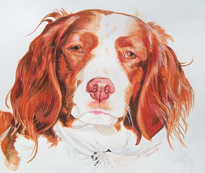 Dog /canine from photo (on right) Portrait art on left Colored pencil/watercolor mixed media