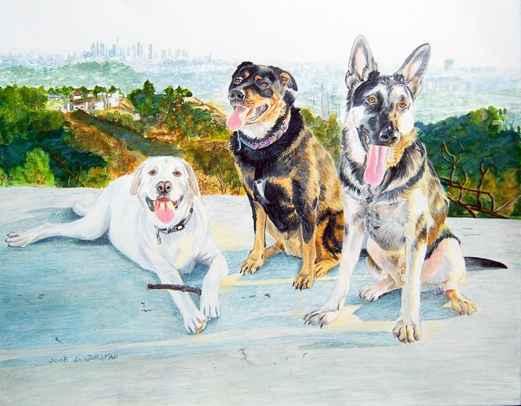 Dogs with Los Angeles background Colored Pencil and watercolor background on watercolor paper