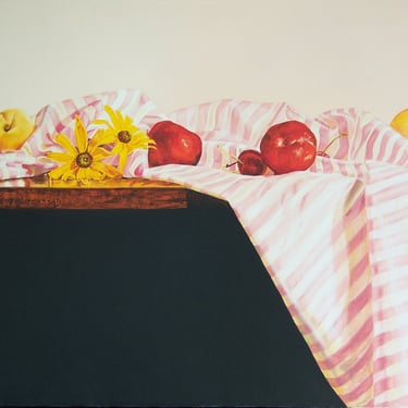 Red SilK Flowers & Apples H 24" X W 36" Oil on stretched canvas Https://Artpal.Com/Dianejorstad